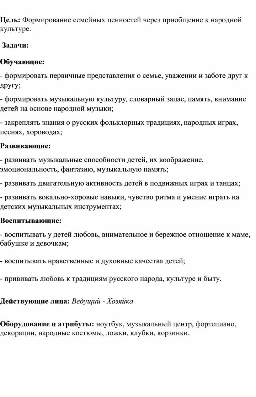 Цель: Формирование семейных ценностей через приобщение к народной культуре.