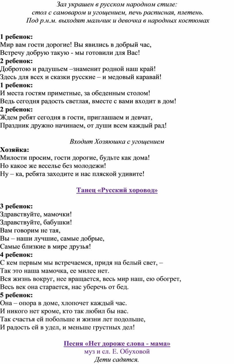 Спасибо, вам ребята и гости дорогие, за душевные посиделки, за уют и тепло. Дорогие мамы! Поздравляю вас с добрым светлым праздником - Днем Матери! Пусть ваши дети дарят вам доброту, внимание, любовь и радуют вас успехами! А вы, ребята, не огорчайте своих мам! Ведь мама на свете одна и ею нужно дорожить. Давайте, ребята, подарим нашим мамам подарки, сделанные своими руками!