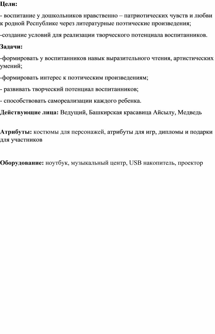 - воспитание у дошкольников нравственно – патриотических чувств и любви к родной Республике через литературные поэтические произведения;