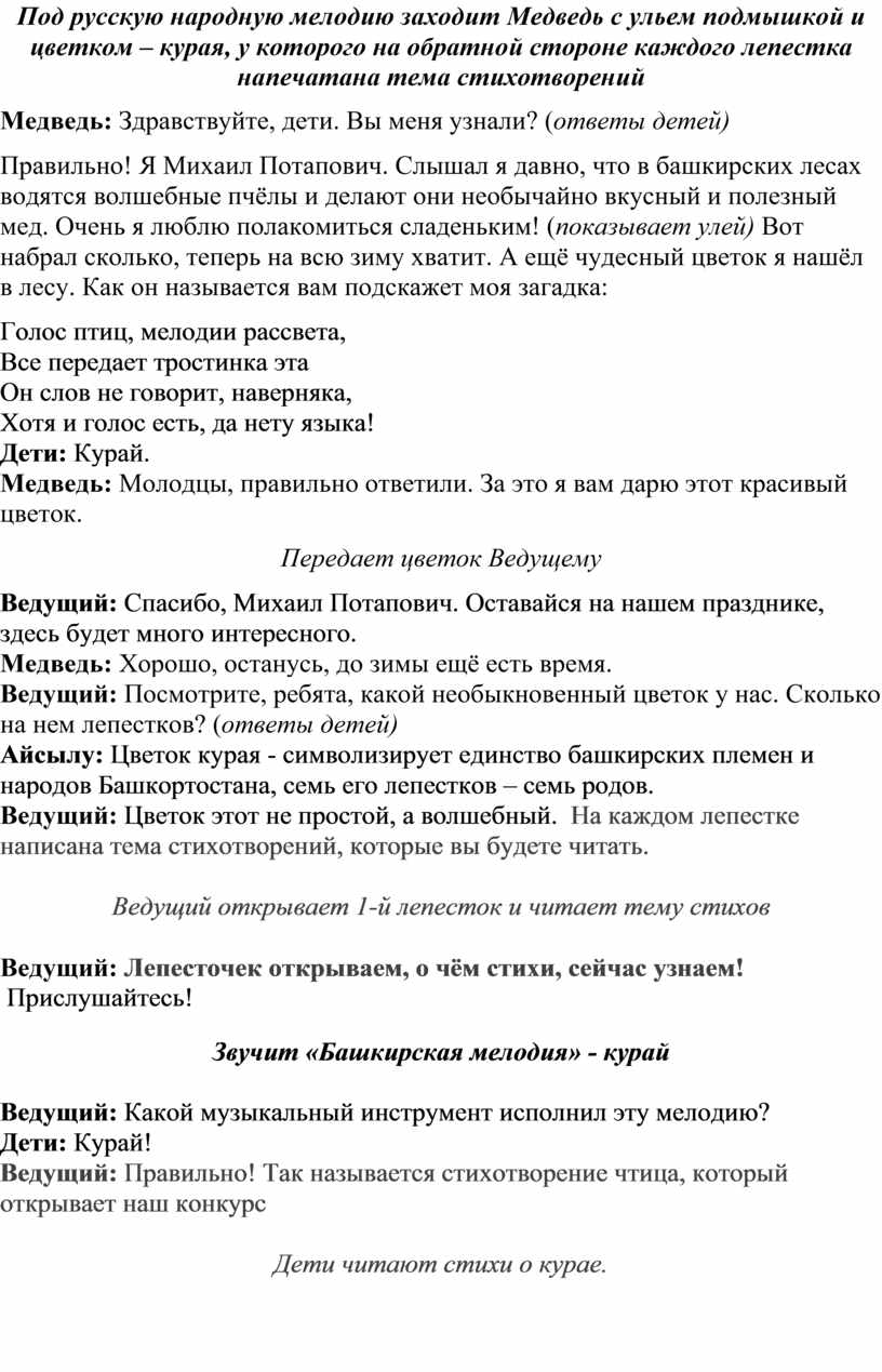 Под русскую народную мелодию заходит Медведь с ульем подмышкой и цветком – курая, у которого на обратной стороне каждого лепестка напечатана тема стихотворений