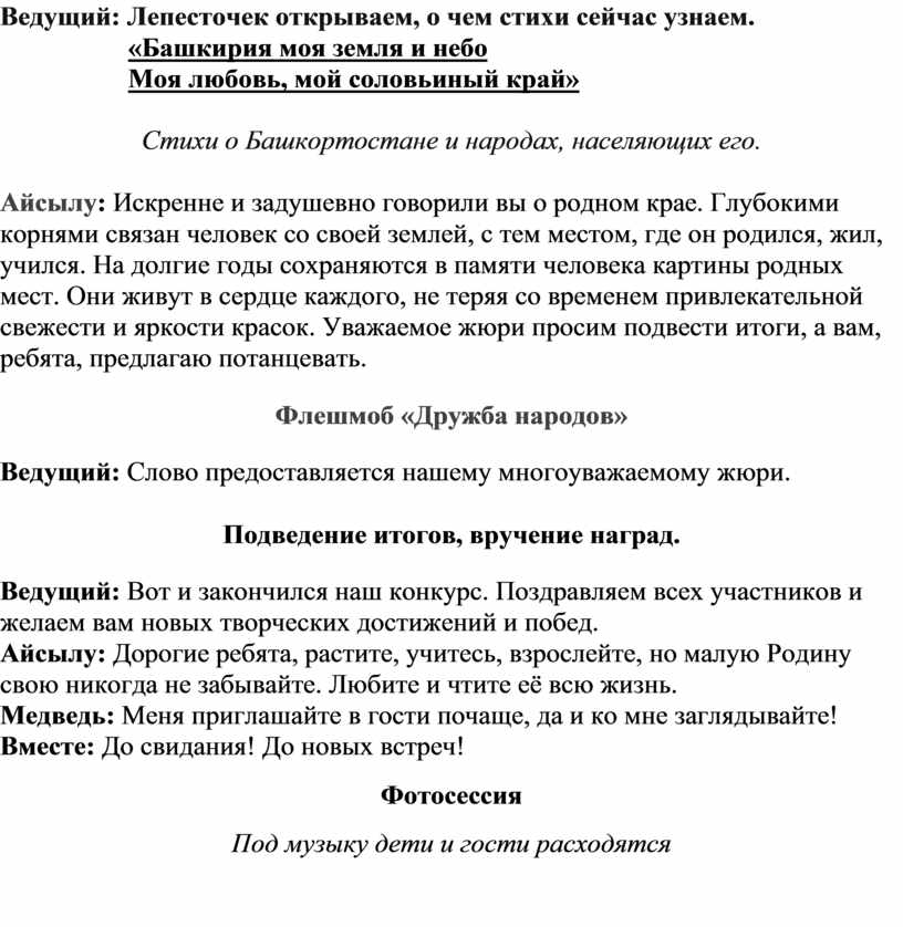 Айсылу: Искренне и задушевно говорили вы о родном крае. Глубокими корнями связан человек со своей землей, с тем местом, где он родился, жил, учился. На долгие годы сохраняются в памяти человека картины родных мест. Они живут в сердце каждого, не теряя со временем привлекательной свежести и яркости красок. Уважаемое жюри просим подвести итоги, а вам, ребята, предлагаю потанцевать.