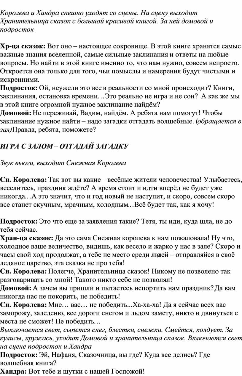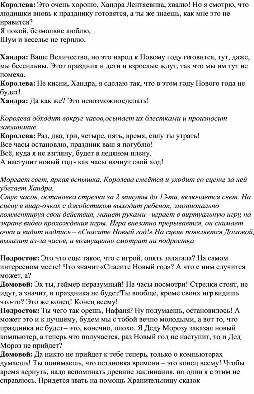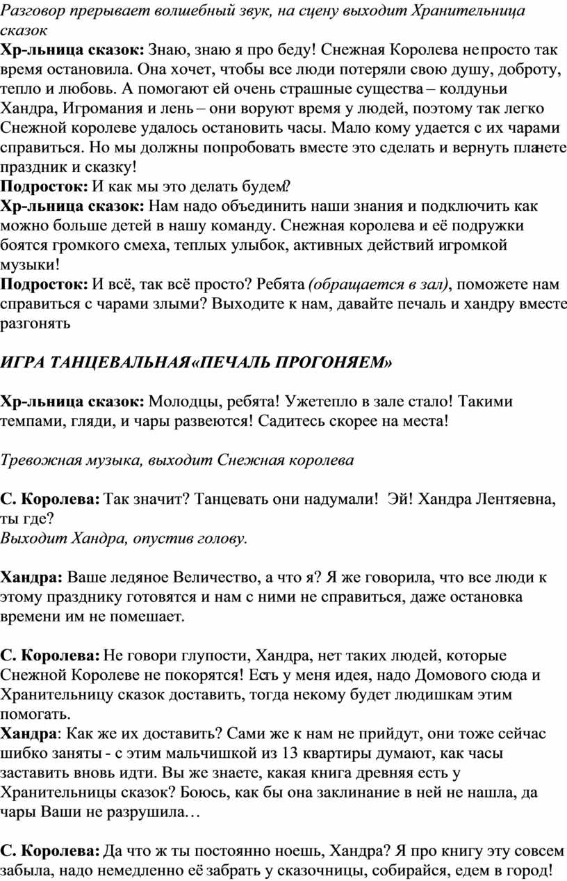 Хр-льница сказок: Знаю, знаю я про беду! Снежная Королева не просто так время остановила. Она хочет, чтобы все люди потеряли свою душу, доброту, тепло и любовь. А помогают ей очень страшные существа – колдуньи Хандра, Игромания и лень – они воруют время у людей, поэтому так легко Снежной королеве удалось остановить часы. Мало кому удается с их чарами справиться. Но мы должны попробовать вместе это сделать и вернуть планете праздник и сказку!