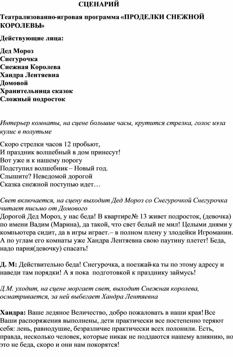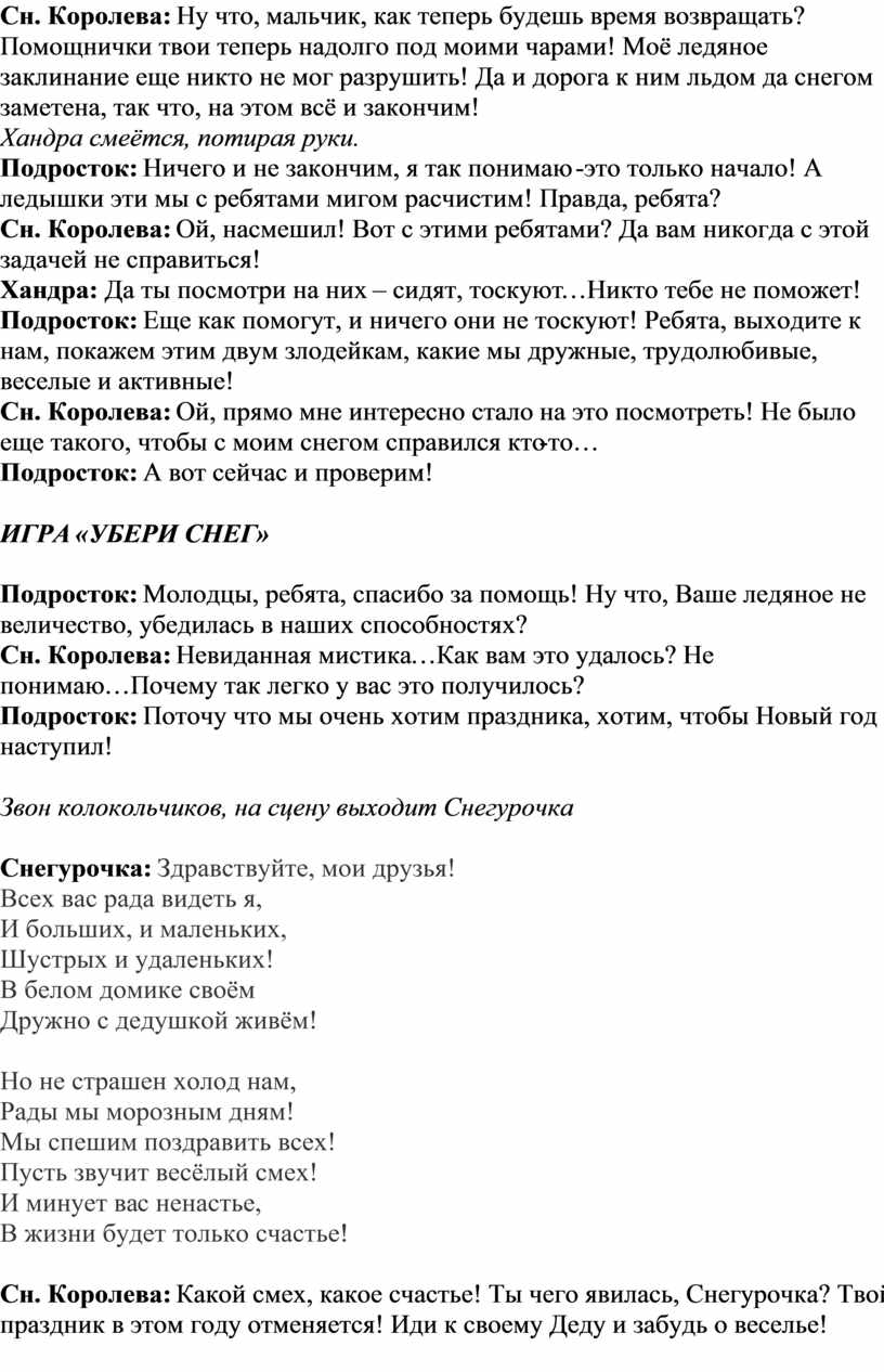 Сн. Королева: Какой смех, какое счастье! Ты чего явилась, Снегурочка? Твой праздник в этом году отменяется! Иди к своему Деду и забудь о веселье!