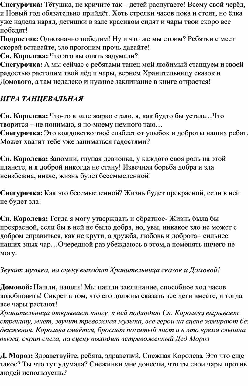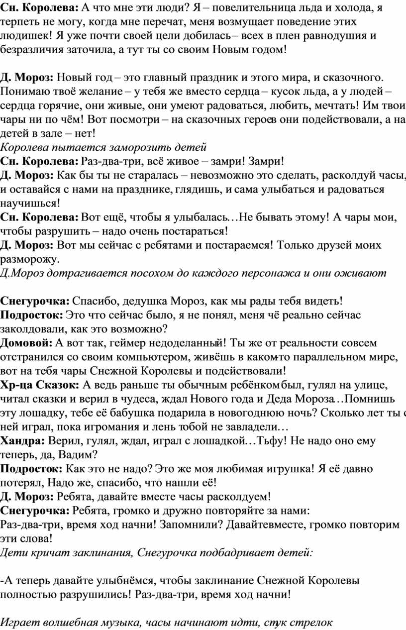 Д. Мороз: Новый год – это главный праздник и этого мира, и сказочного. Понимаю твоё желание – у тебя же вместо сердца – кусок льда, а у людей – сердца горячие, они живые, они умеют радоваться, любить, мечтать! Им твои чары ни по чём! Вот посмотри – на сказочных героев они подействовали, а на детей в зале – нет!