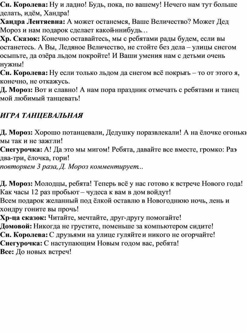 Хр. Сказок: Конечно оставайтесь, мы с ребятами рады будем, если вы останетесь. А Вы, Ледяное Величество, не стойте без дела – улицы снегом осыпьте, да озёра льдом покройте! И Ваши умения нам с детьми очень нужны!