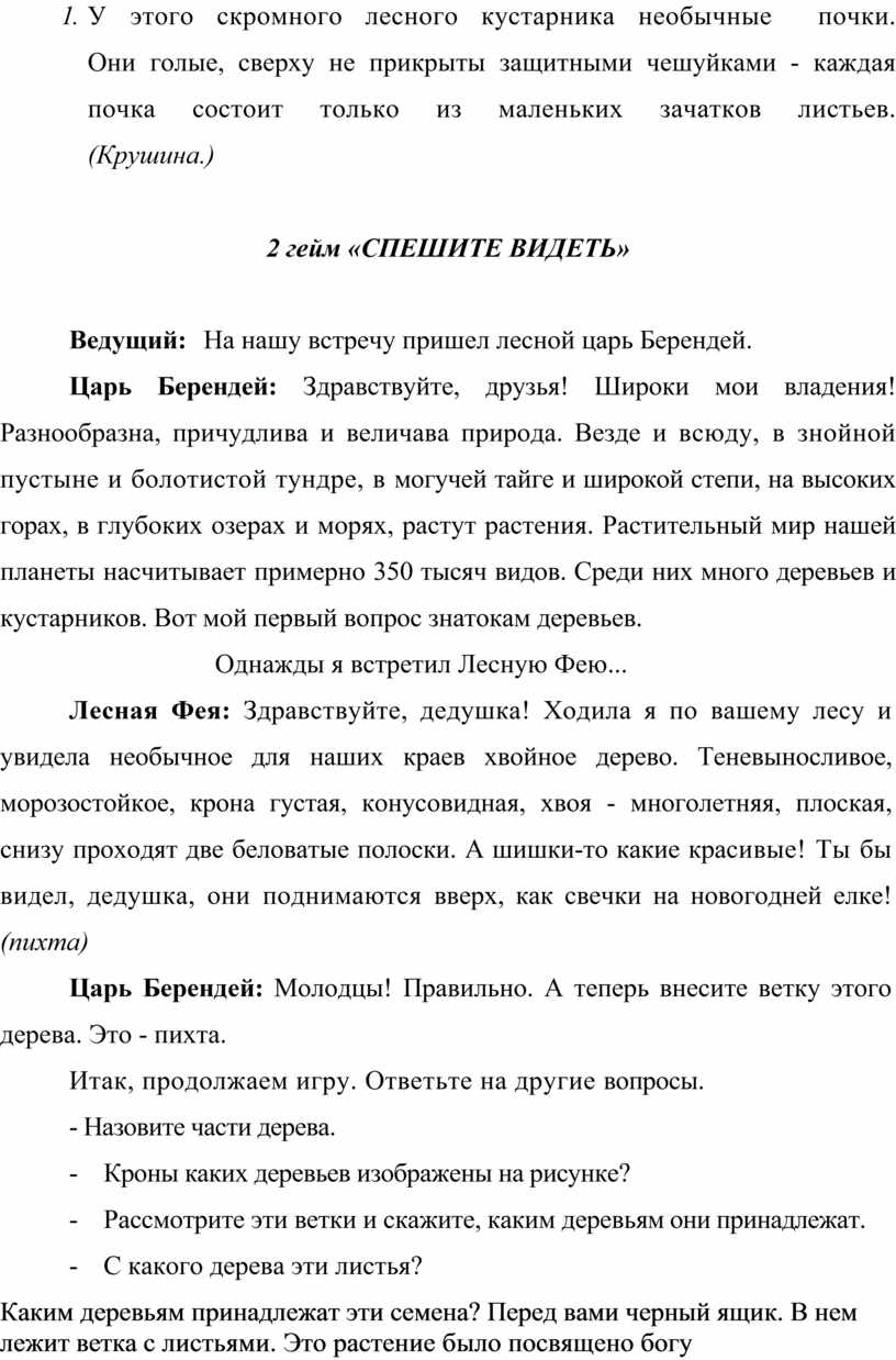 Царь Берендей: Здравствуйте, друзья! Широки мои владения! Разнообразна, причудлива и величава природа. Везде и всюду, в знойной пустыне и болотистой тундре, в могучей тайге и широкой степи, на высоких горах, в глубоких озерах и морях, растут растения. Растительный мир нашей планеты насчитывает примерно 350 тысяч видов. Среди них много деревьев и кустарников. Вот мой первый вопрос знатокам деревьев.