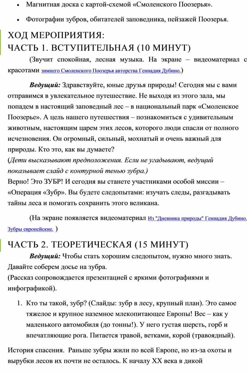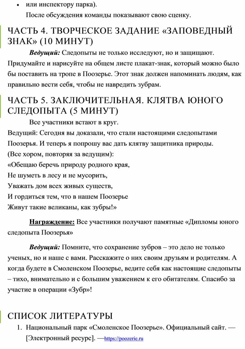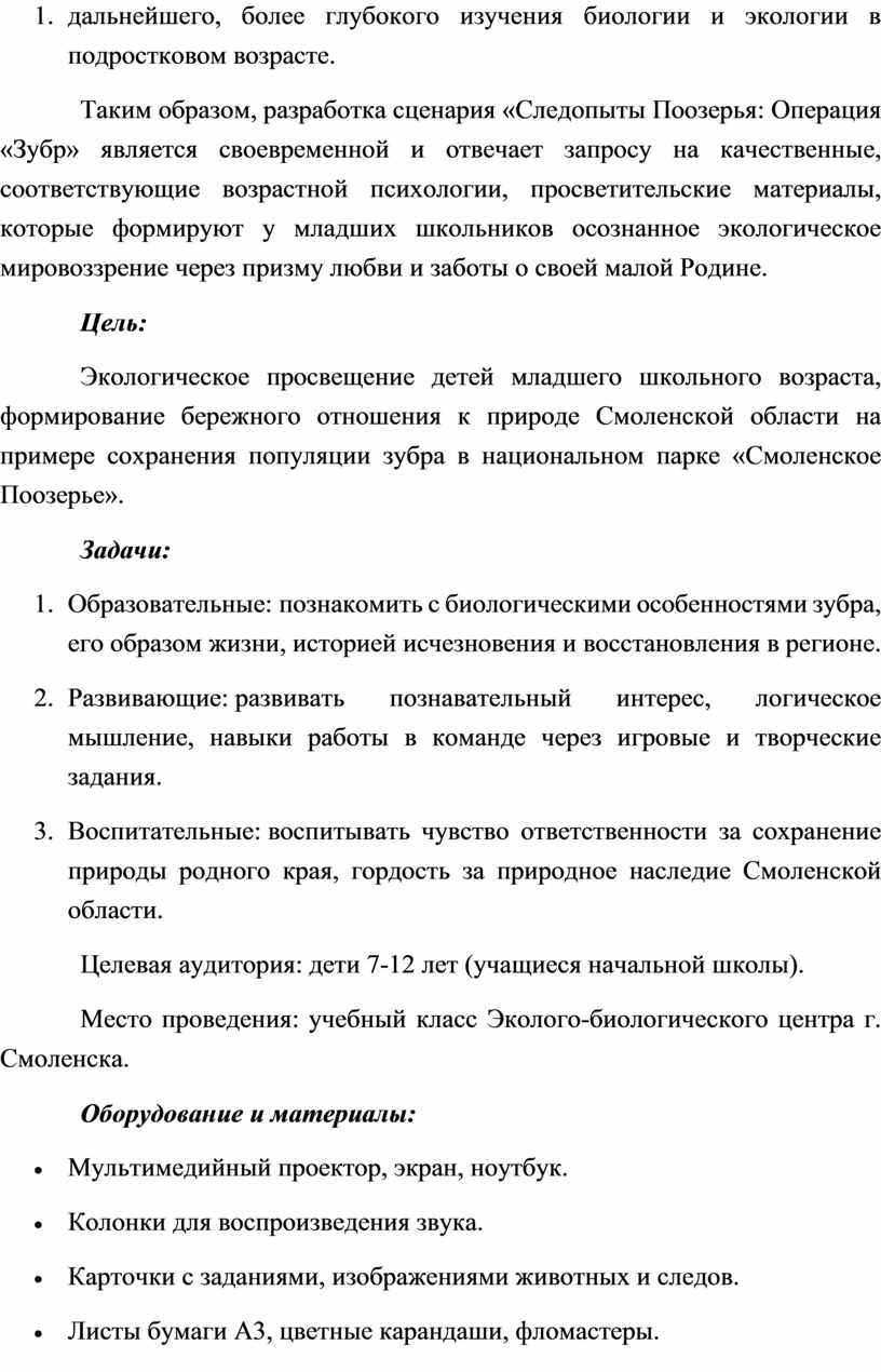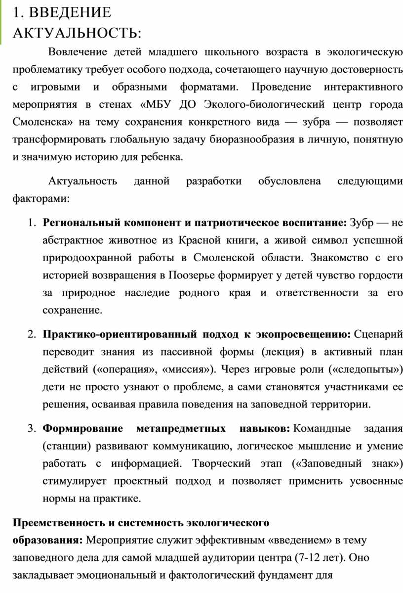 Таким образом, разработка сценария «Следопыты Поозерья: Операция «Зубр» является своевременной и отвечает запросу на качественные, соответствующие возрастной психологии, просветительские материалы, которые формируют у младших школьников осознанное экологическое мировоззрение через призму любви и заботы о своей малой Родине.