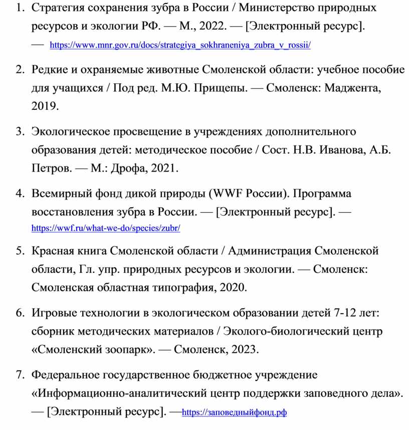 2. Стратегия сохранения зубра в России / Министерство природных ресурсов и экологии РФ. — М., 2022. — [Электронный ресурс]. — https://www.mnr.gov.ru/docs/strategiya_sokhraneniya_zubra_v_rossii/