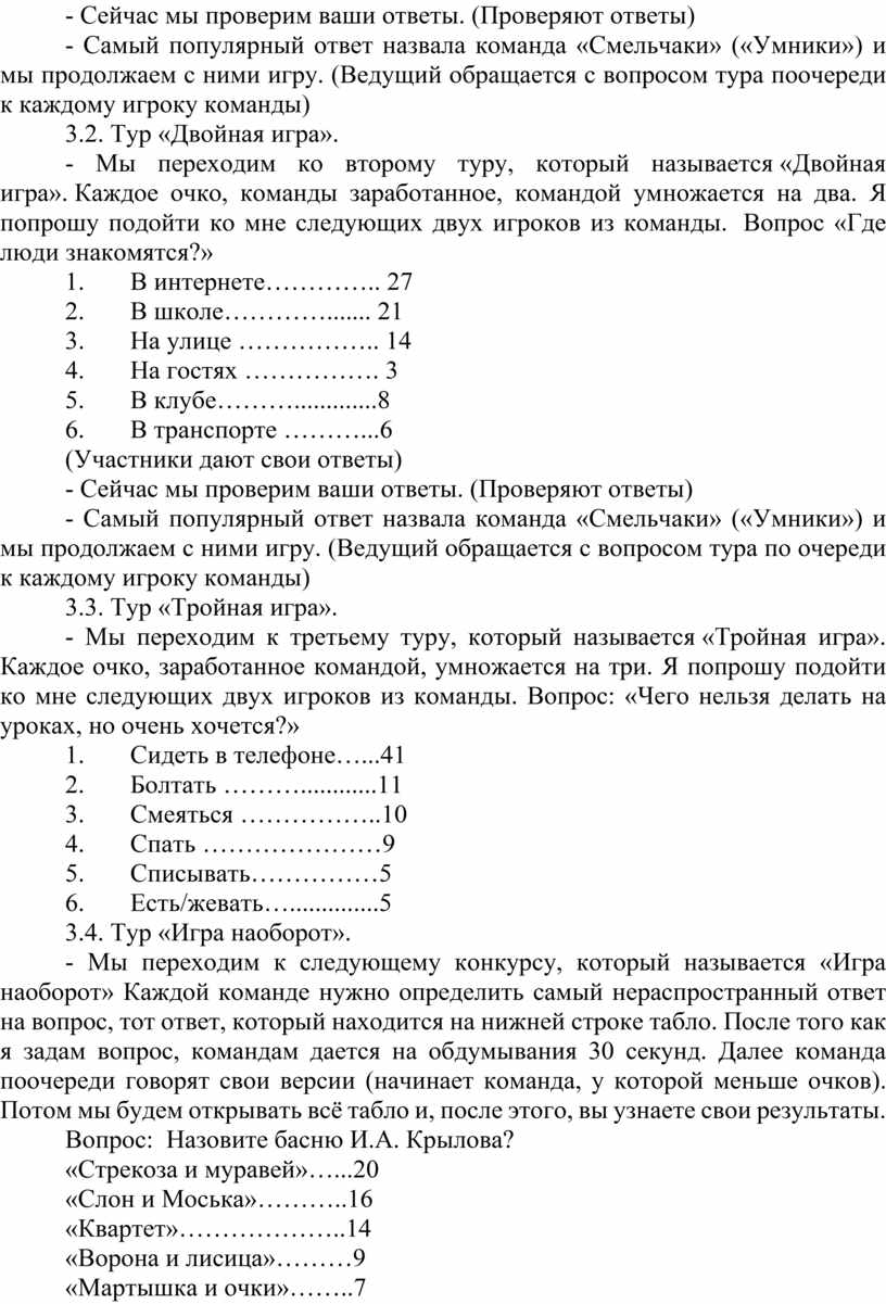 - Самый популярный ответ назвала команда «Смельчаки» («Умники») и мы продолжаем с ними игру. (Ведущий обращается с вопросом тура поочереди к каждому игроку команды)