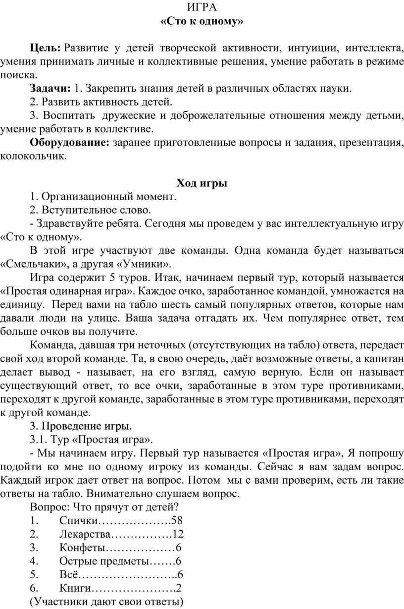 - Здравствуйте ребята. Сегодня мы проведем у вас интеллектуальную игру «Сто к одному».