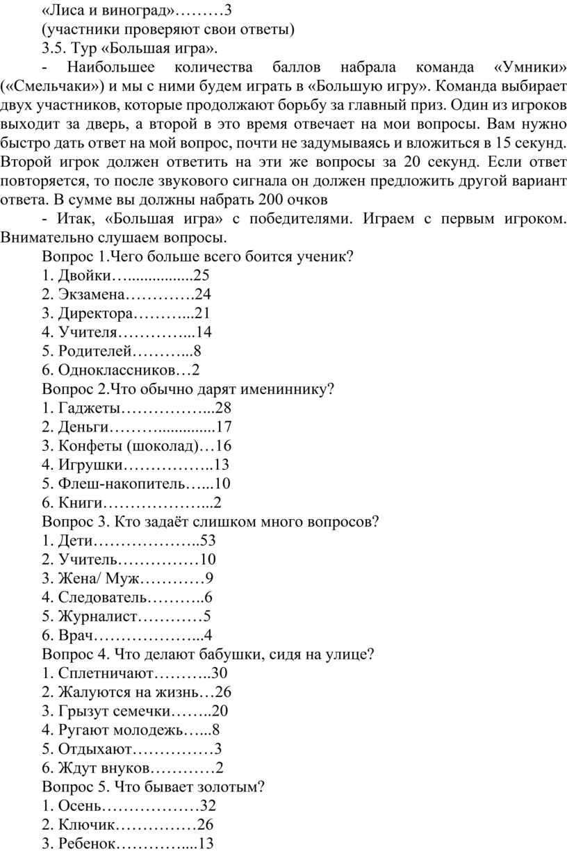 - Наибольшее количества баллов набрала команда «Умники» («Смельчаки») и мы с ними будем играть в «Большую игру». Команда выбирает двух участников, которые продолжают борьбу за главный приз. Один из игроков выходит за дверь, а второй в это время отвечает на мои вопросы. Вам нужно быстро дать ответ на мой вопрос, почти не задумываясь и вложиться в 15 секунд. Второй игрок должен ответить на эти же вопросы за 20 секунд. Если ответ повторяется, то после звукового сигнала он должен предложить другой вариант ответа. В сумме вы должны набрать 200 очков