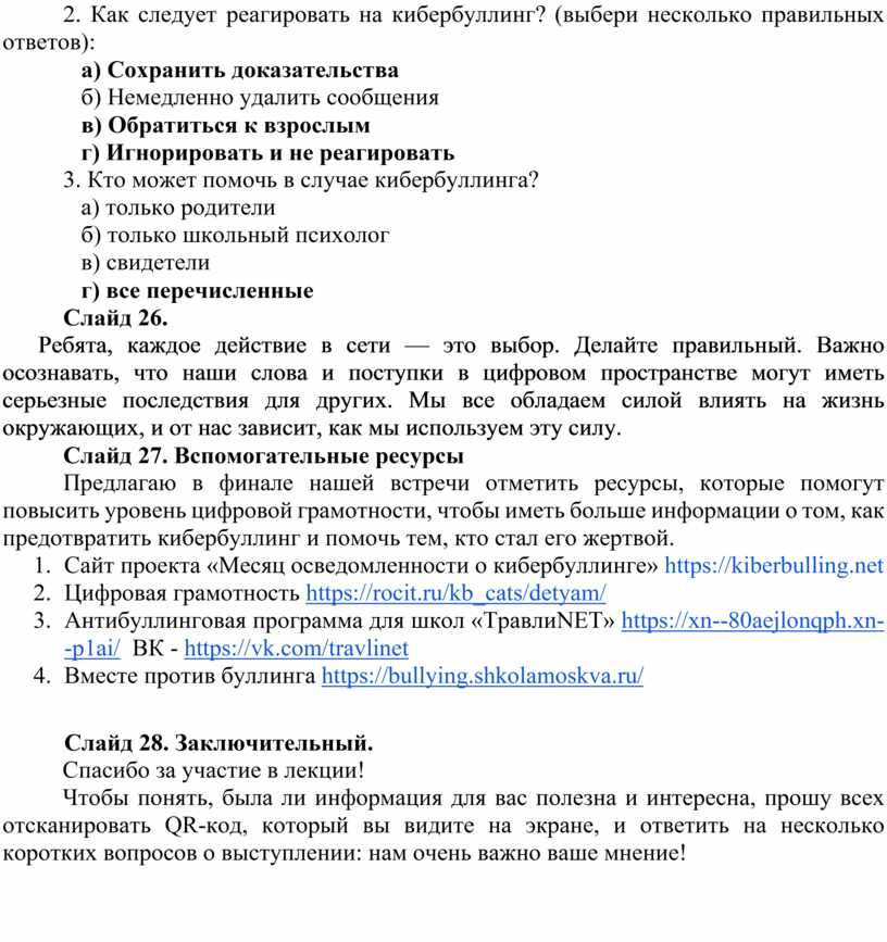 Ребята, каждое действие в сети — это выбор. Делайте правильный. Важно осознавать, что наши слова и поступки в цифровом пространстве могут иметь серьезные последствия для других. Мы все обладаем силой влиять на жизнь окружающих, и от нас зависит, как мы используем эту силу.