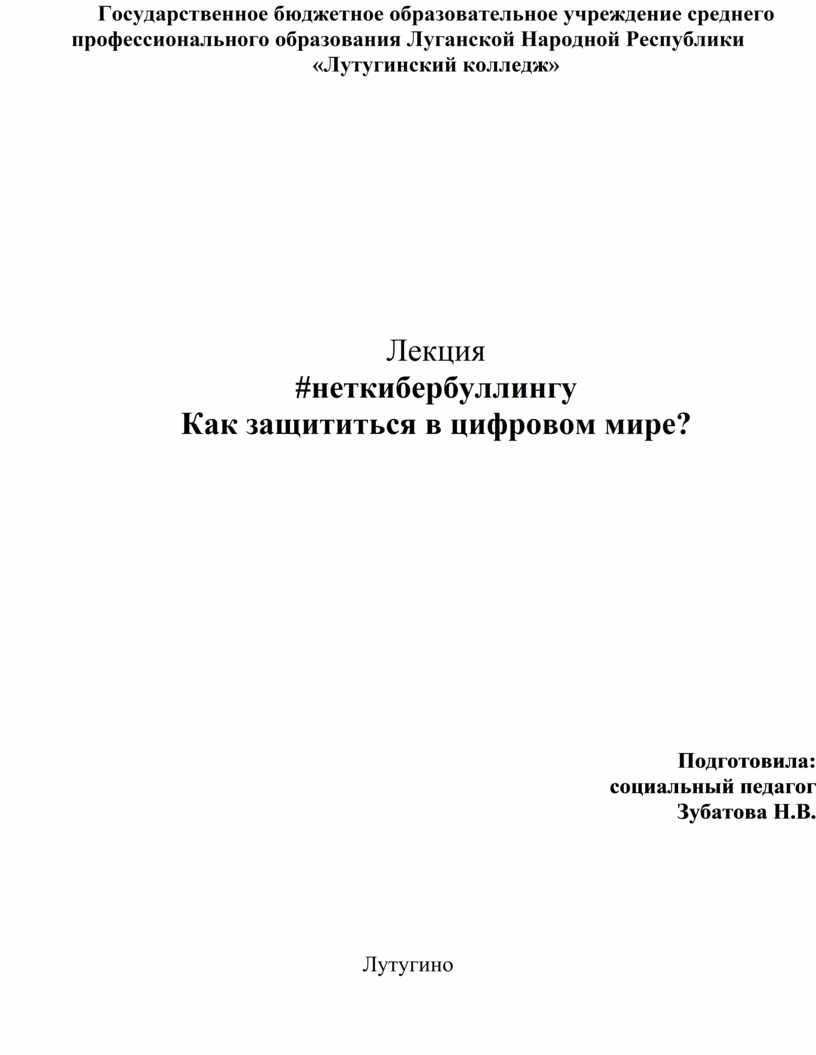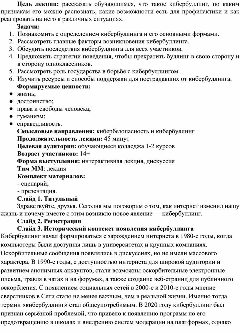 Цель лекции: рассказать обучающимся, что такое кибербуллинг, по каким признакам его можно распознать, какие возможности есть для профилактики и как реагировать на него в различных ситуациях.