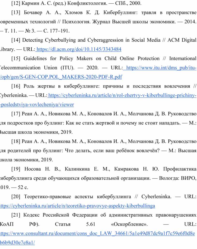 [3] Хломов К. Д., Давыдов Д. Г., Бочавер А. А. Кибербуллинг в опыте российских подростков // Психология и право. — 2019. — Т. 9. — № 2. — С. 276–295.