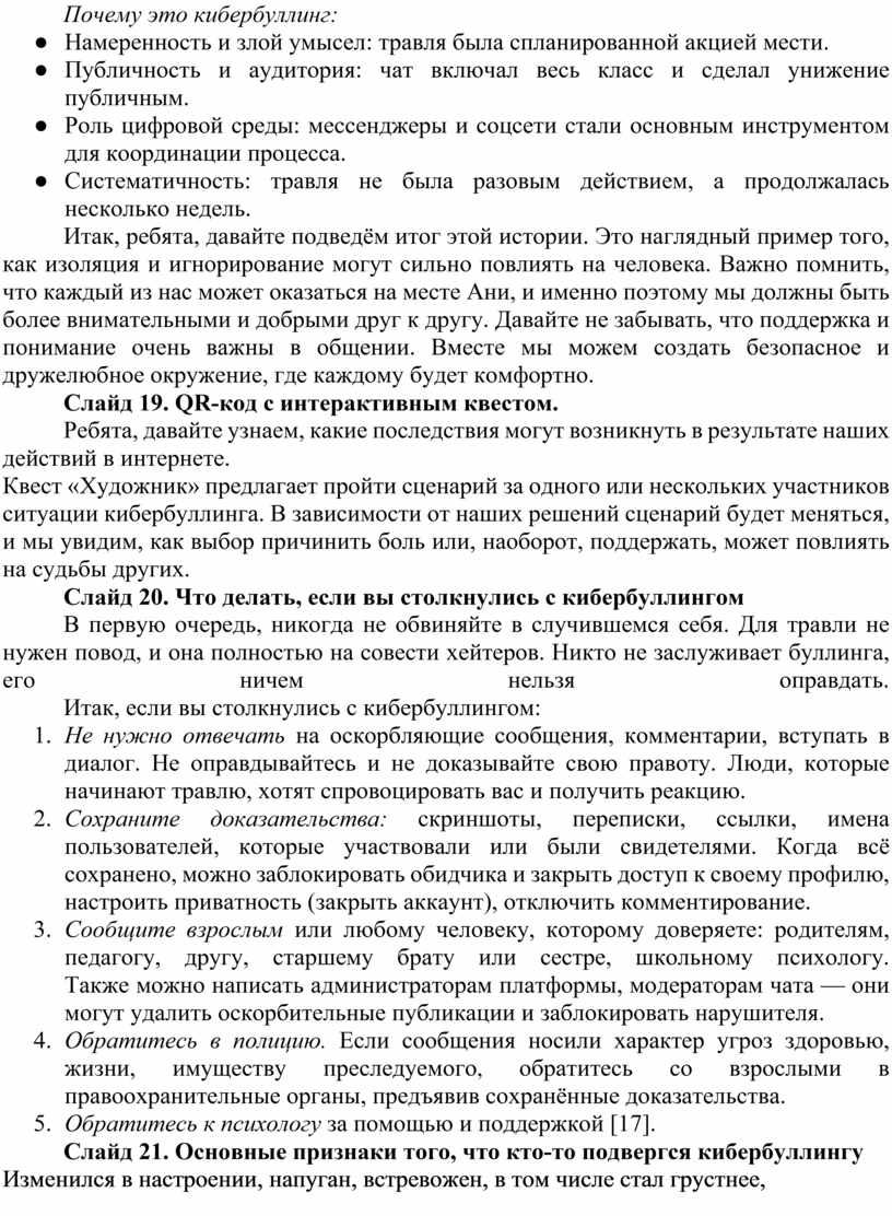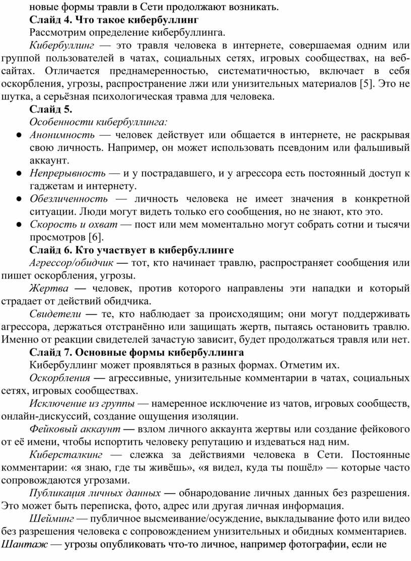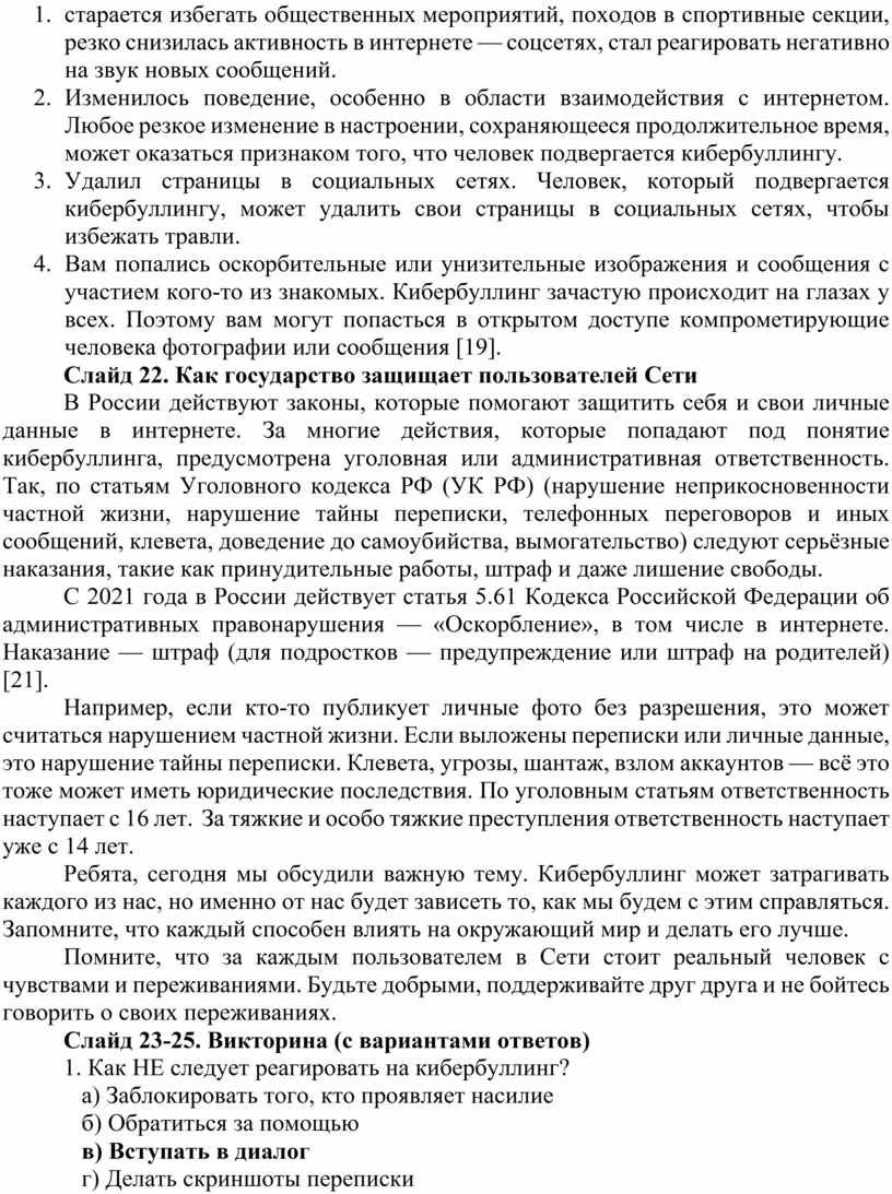 [7] Газизьянов Т. А., Мансурова З. Р. Психология кибербуллинга: виды и причины кибербуллинга // Общество, право, государственность: ретроспектива и перспектива. — 2023. — № 4 (16). — С. 89–92. — URL: https://cyberleninka.ru/article/n/psihologiya-kiberbullinga-vidy-i-prichiny-kiberbullinga/viewer