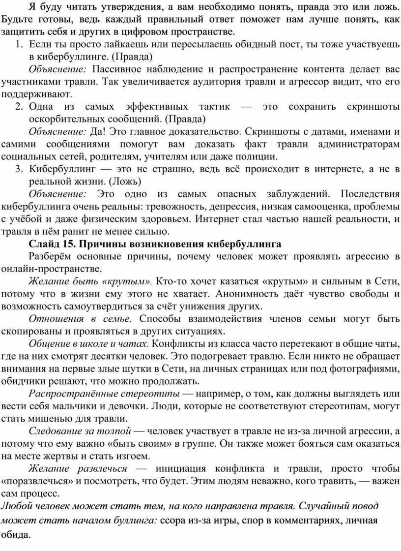 Объяснение: Это одно из самых опасных заблуждений. Последствия кибербуллинга очень реальны: тревожность, депрессия, низкая самооценка, проблемы с учёбой и даже физическим здоровьем. Интернет стал частью нашей реальности, и травля в нём ранит не менее сильно.