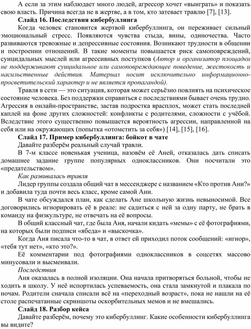 Давайте разберём, почему это кибербуллинг. Какие особенности кибербуллинга вы видите?