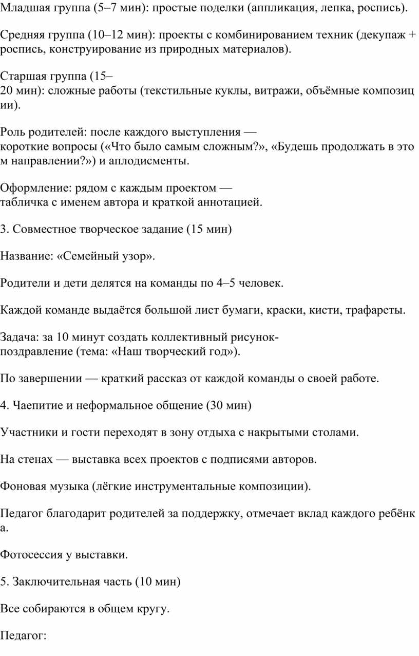 Старшая группа (15–20 мин): сложные работы (текстильные куклы, витражи, объёмные композиции).