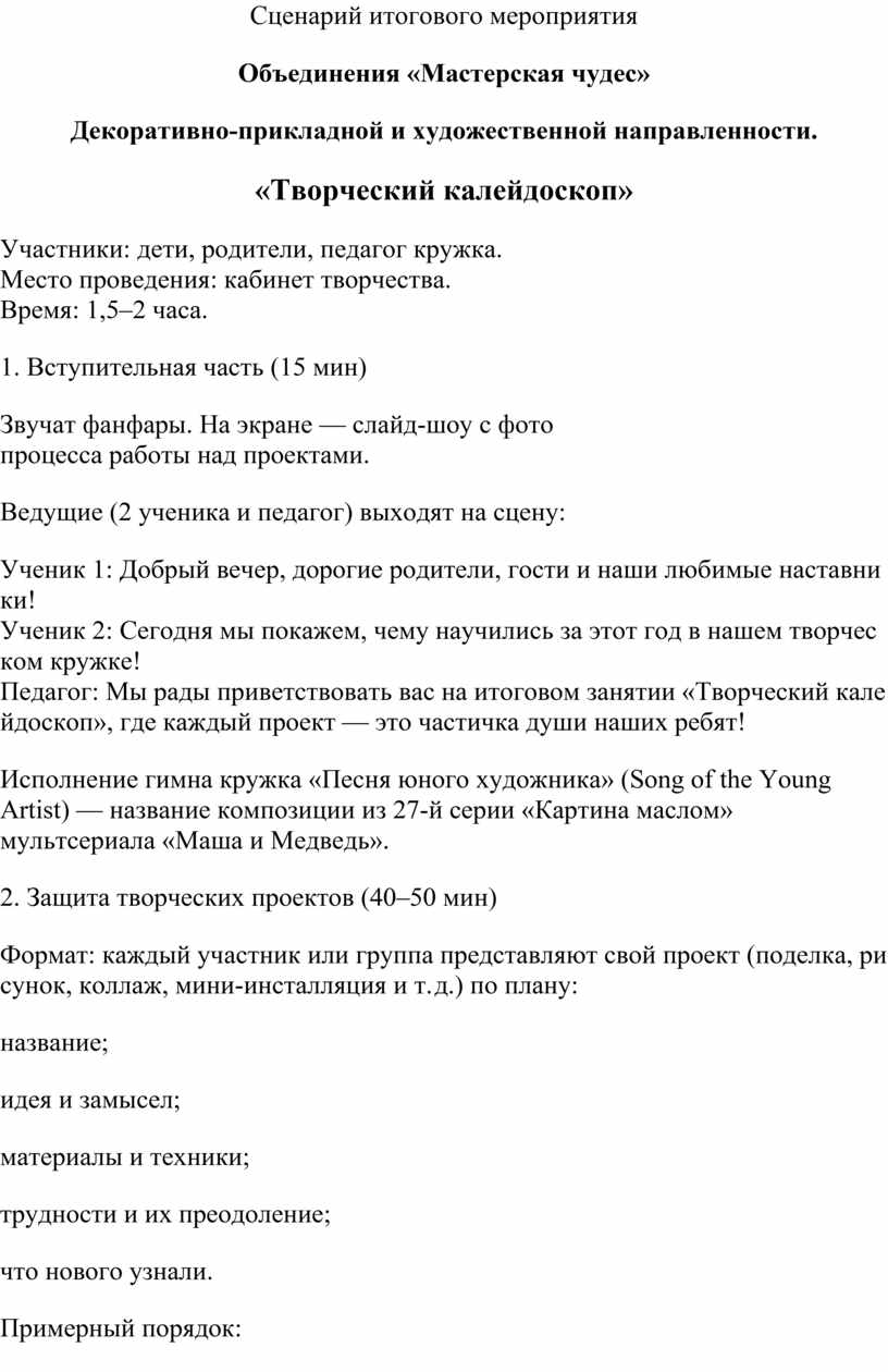 Педагог: Мы рады приветствовать вас на итоговом занятии «Творческий калейдоскоп», где каждый проект —