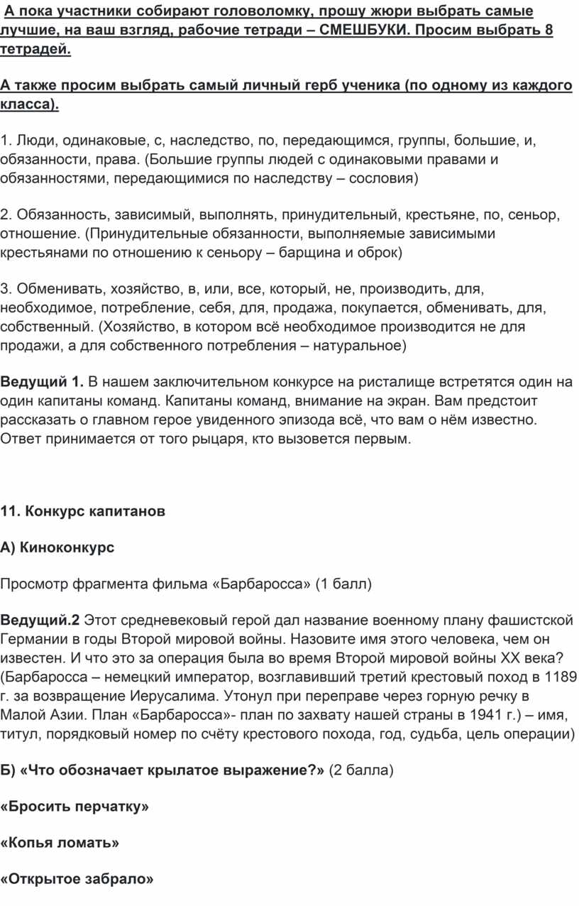 Ведущий.2 Этот средневековый герой дал название военному плану фашистской Германии в годы Второй мировой войны. Назовите имя этого человека, чем он известен. И что это за операция была во время Второй мировой войны ХХ века? (Барбаросса – немецкий император, возглавивший третий крестовый поход в 1189 г. за возвращение Иерусалима. Утонул при переправе через горную речку в Малой Азии. План «Барбаросса»- план по захвату нашей страны в 1941 г.) – имя, титул, порядковый номер по счёту крестового похода, год, судьба, цель операции)