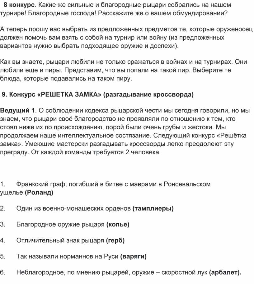 Ведущий 1. О соблюдении кодекса рыцарской чести мы сегодня говорили, но мы знаем, что рыцари своё благородство не проявляли по отношению к тем, кто стоял ниже их по происхождению, порой были очень грубы и жестоки. Мы продолжаем наше интеллектуальное состязание. Следующий конкурс «Решётка замка». Умеющие мастерски разгадывать кроссворды легко преодолеют эту преграду. От каждой команды требуется 2 человека.