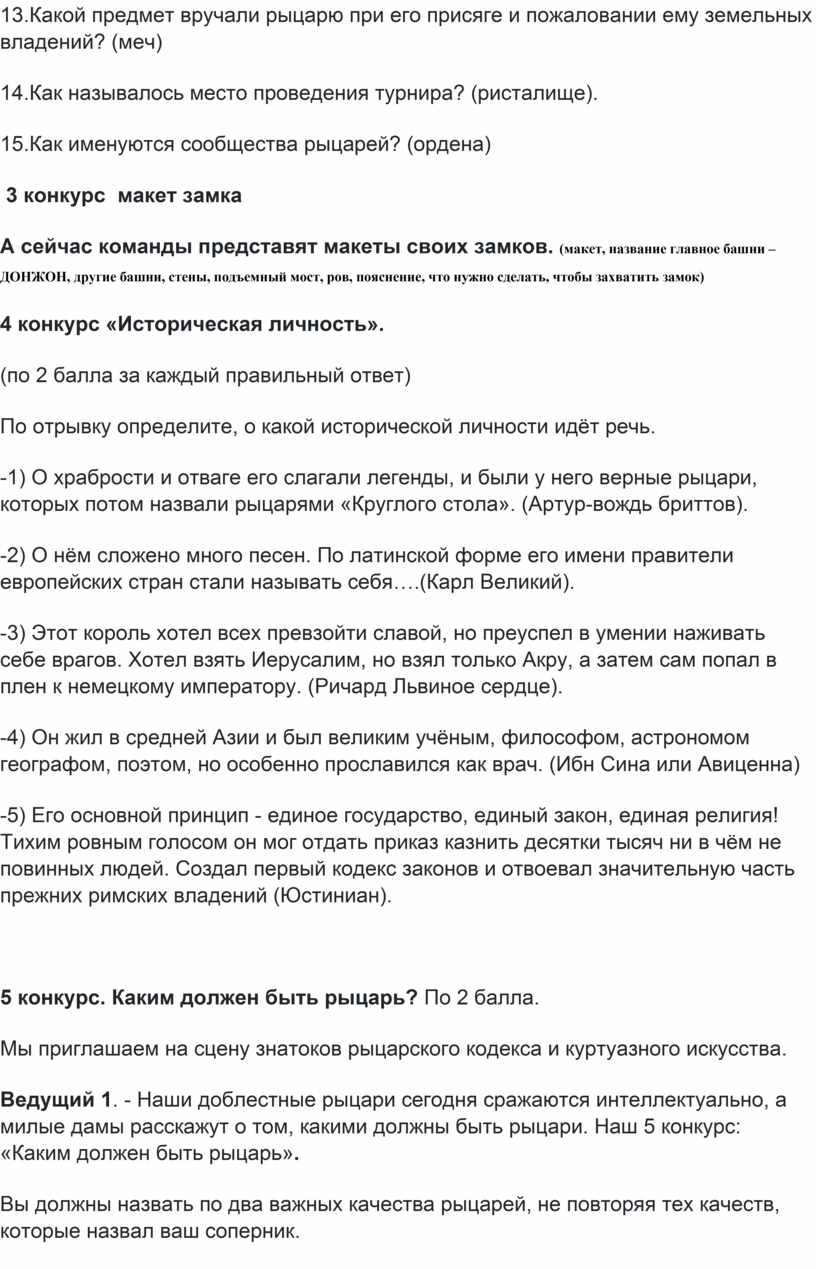Ведущий 1. - Наши доблестные рыцари сегодня сражаются интеллектуально, а милые дамы расскажут о том, какими должны быть рыцари. Наш 5 конкурс: «Каким должен быть рыцарь».