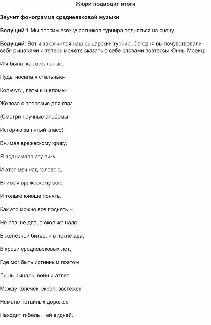 Ведущий: Вот и закончился наш рыцарский турнир. Сегодня вы почувствовали себя рыцарями и теперь можете сказать о себе словами поэтессы Юнны Мориц: