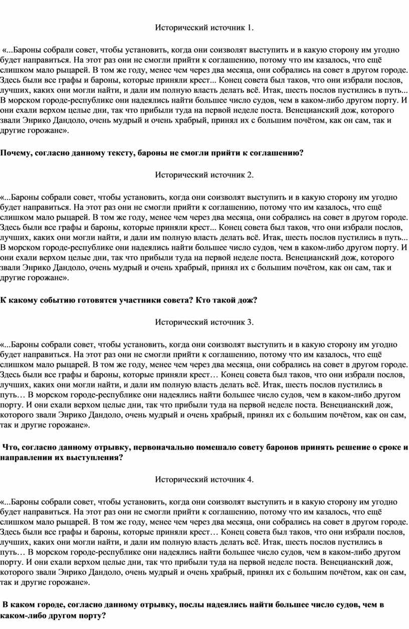 «...Бароны собрали совет, чтобы установить, когда они соизволят выступить и в какую сторону им угодно будет направиться. На этот раз они не смогли прийти к соглашению, потому что им казалось, что ещё слишком мало рыцарей. В том же году, менее чем через два месяца, они собрались на совет в другом городе. Здесь были все графы и бароны, которые приняли крест… Конец совета был таков, что они избрали послов, лучших, каких они могли найти, и дали им полную власть делать всё. Итак, шесть послов пустились в путь… В морском городе-республике они надеялись найти большее число судов, чем в каком-либо другом порту. И они ехали верхом целые дни, так что прибыли туда на первой неделе поста. Венецианский дож, которого звали Энрико Дандоло, очень мудрый и очень храбрый, принял их с большим почётом, как он сам, так и другие горожане».