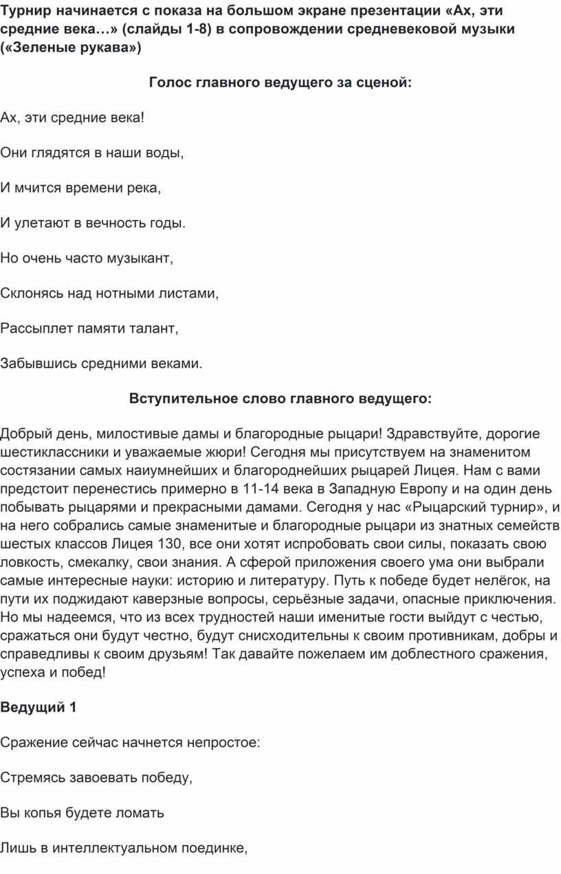 Добрый день, милостивые дамы и благородные рыцари! Здравствуйте, дорогие шестиклассники и уважаемые жюри! Сегодня мы присутствуем на знаменитом состязании самых наиумнейших и благороднейших рыцарей Лицея. Нам с вами предстоит перенестись примерно в 11-14 века в Западную Европу и на один день побывать рыцарями и прекрасными дамами. Сегодня у нас «Рыцарский турнир», и на него собрались самые знаменитые и благородные рыцари из знатных семейств шестых классов Лицея 130, все они хотят испробовать свои силы, показать свою ловкость, смекалку, свои знания. А сферой приложения своего ума они выбрали самые интересные науки: историю и литературу. Путь к победе будет нелёгок, на пути их поджидают каверзные вопросы, серьёзные задачи, опасные приключения. Но мы надеемся, что из всех трудностей наши именитые гости выйдут с честью, сражаться они будут честно, будут снисходительны к своим противникам, добры и справедливы к своим друзьям! Так давайте пожелаем им доблестного сражения, успеха и побед!