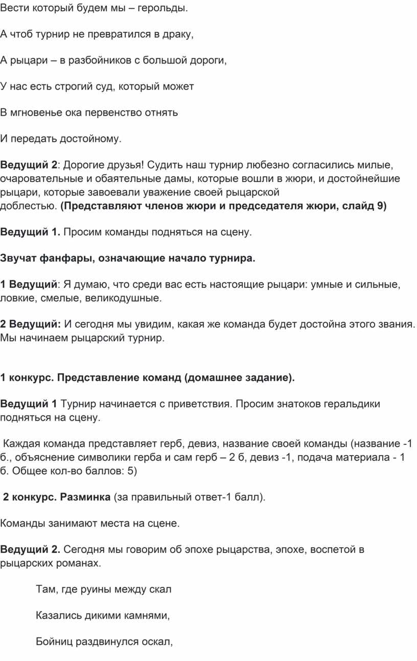 Ведущий 2: Дорогие друзья! Судить наш турнир любезно согласились милые, очаровательные и обаятельные дамы, которые вошли в жюри, и достойнейшие рыцари, которые завоевали уважение своей рыцарской доблестью. (Представляют членов жюри и председателя жюри, слайд 9)