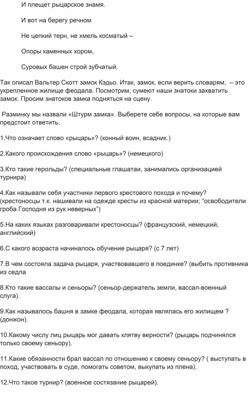 Так описал Вальтер Скотт замок Кэдьо. Итак, замок, если верить словарям, – это укрепленное жилище феодала. Посмотрим, сумеют наши знатоки захватить замок. Просим знатоков замка подняться на сцену.