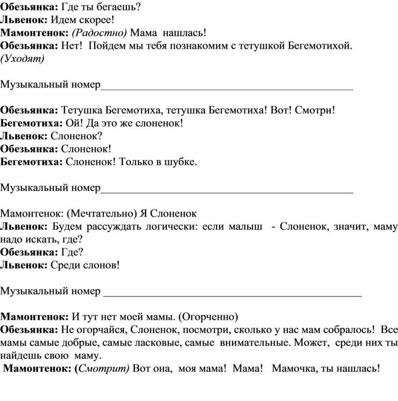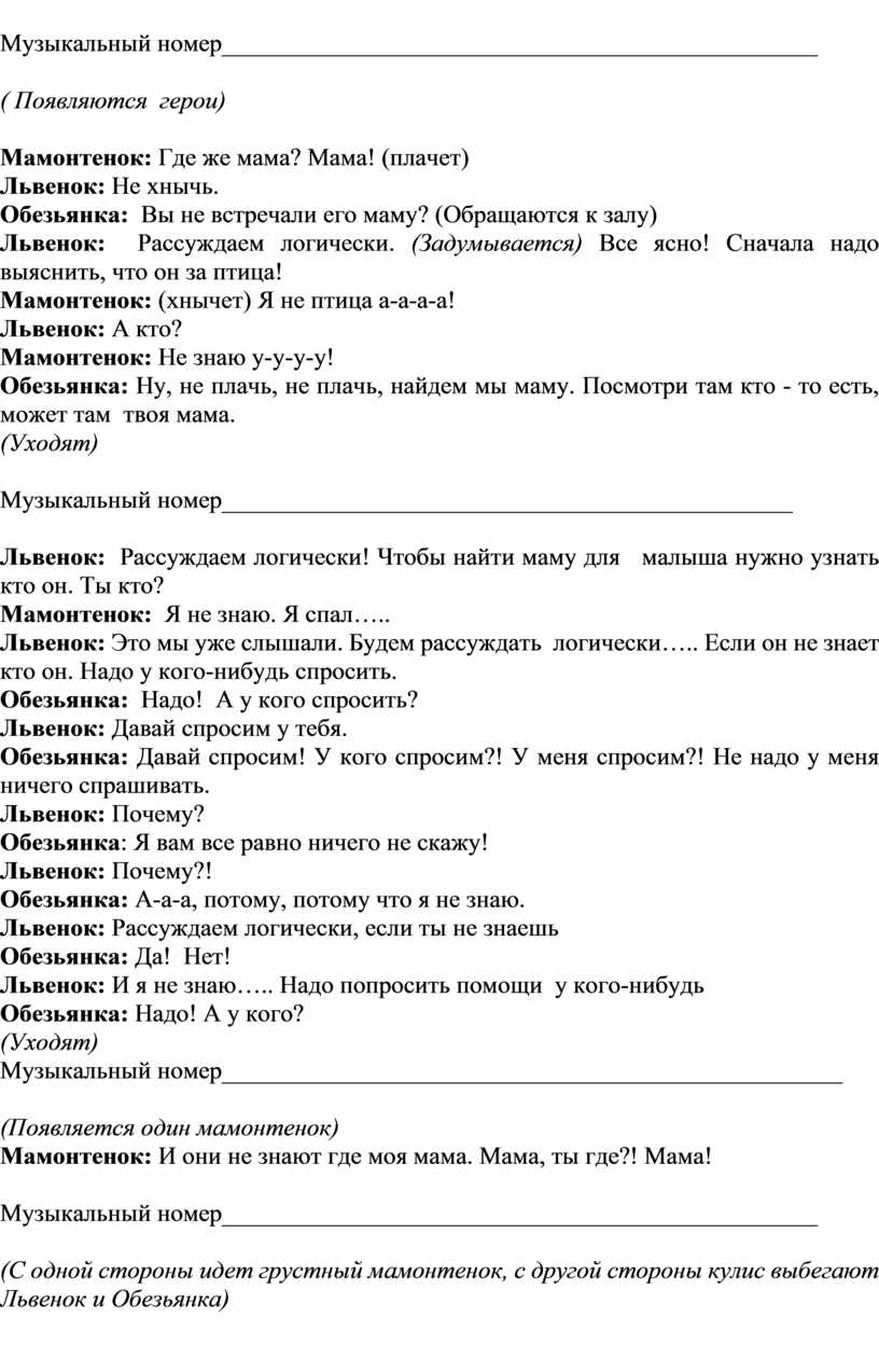 Выходит Настя в костюме Мамонтенка исполняет песню. По окончании песни на сцену выбегает ____________ в костюме обезьянки, бегает вокруг Мамонтенка