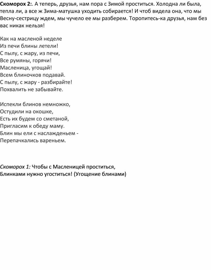 Скоморох 1:Масленица — это озорное и весёлое прощание с зимой и встреча весны, несущей оживление в природе и солнечное тепло. Люди испокон веков воспринимали весну как начало новой жизни и почитали Солнце, дающее жизнь и силы всему живому. В честь солнца сначала пекли пресные лепёшки, а когда научились приготовлять заквасное тесто, стали печь блины.