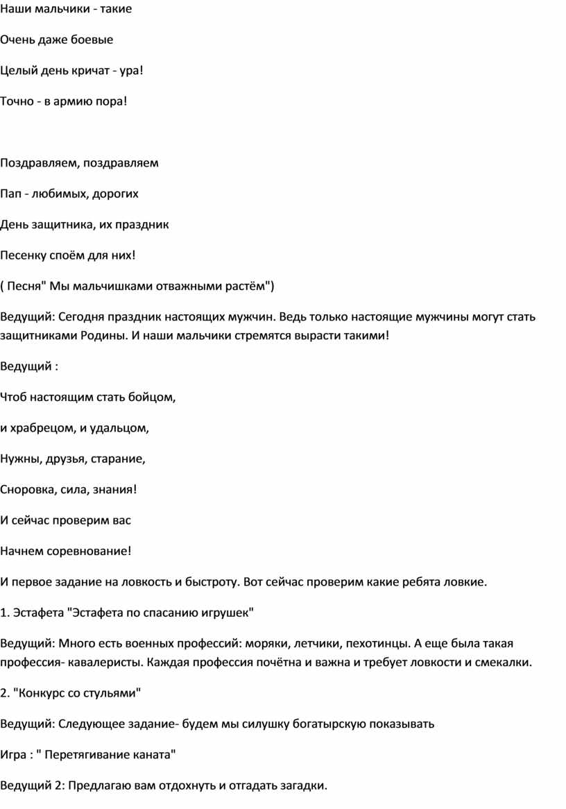 Ведущий: Сегодня праздник настоящих мужчин. Ведь только настоящие мужчины могут стать защитниками Родины. И наши мальчики стремятся вырасти такими!