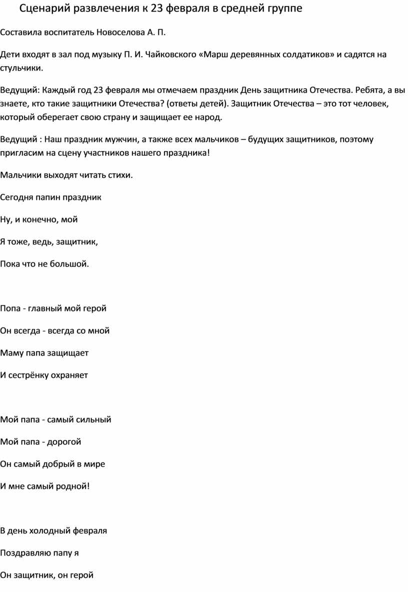 Сценарий развлечения к 23 февраля в средней группе