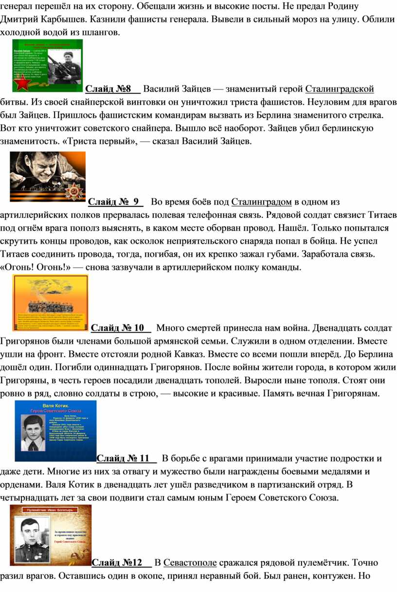 Нелёгким был путь к победе. Враги напали на нас неожиданно. У них было больше танков и самолётов. Наши армии отступали. Бои шли на земле, в небе, на море. Прогремели великие битвы: Московская, Сталинградская, битва на Курской дуге. 250 дней не сдавался врагу героический Севастополь. 900 дней в страшной блокаде держался мужественный Ленинград. Отважно сражался Кавказ. На Украине, в Белоруссии, в других местах громили захватчиков грозные партизаны. Миллионы людей, в том числе и дети, трудились у заводских станков и на полях страны. Советские люди (Советский Союз — так называлась в те годы наша страна) делали всё, чтобы остановить фашистов. Даже в самые тяжёлые дни они твёрдо верили: «Враг будет разбит! Победа будет за нами!»