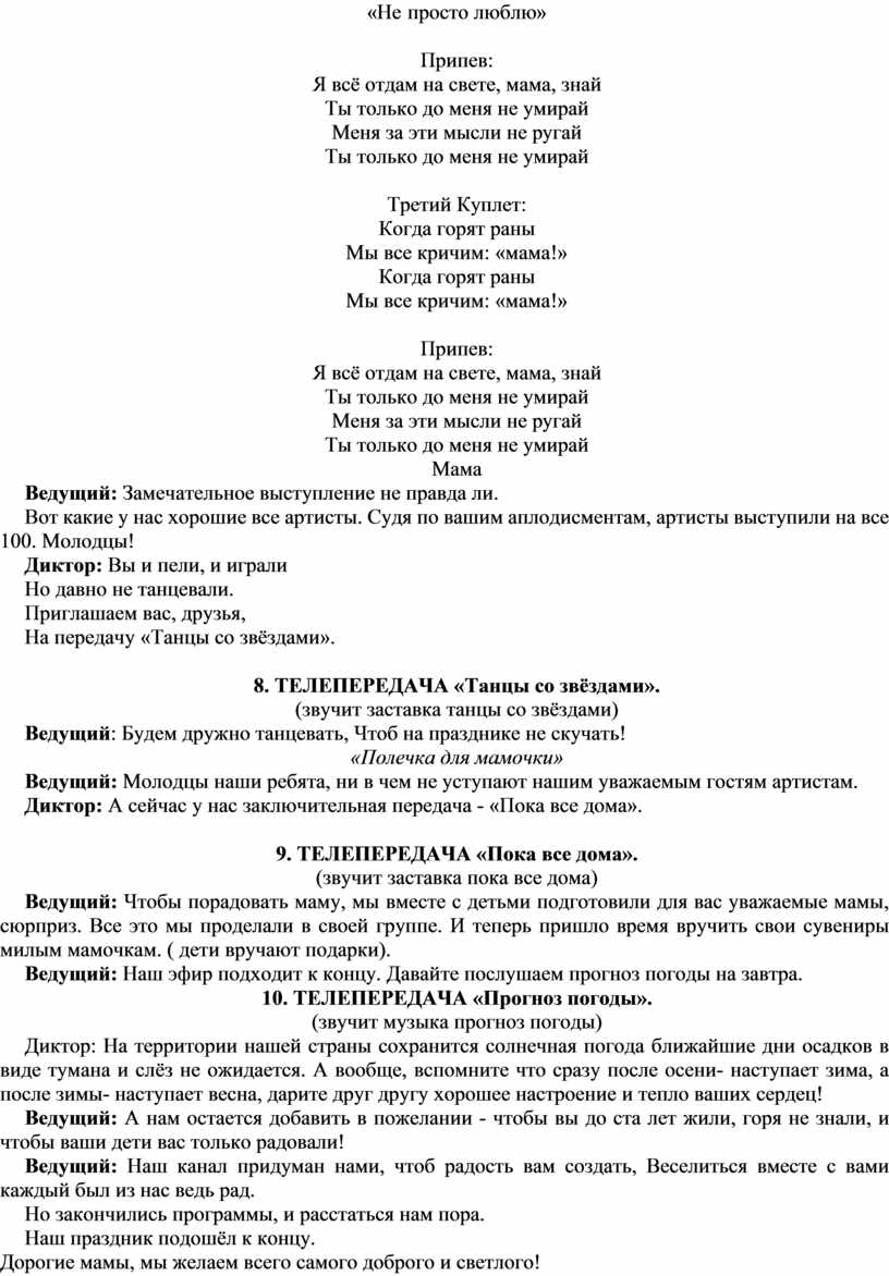 Ведущий: Вот видите, дорогие мамы, как любят вас дети! Какие вы красивые и добрые, заботливые и чуткие. И я присоединяюсь к поздравлениям наших ребят.