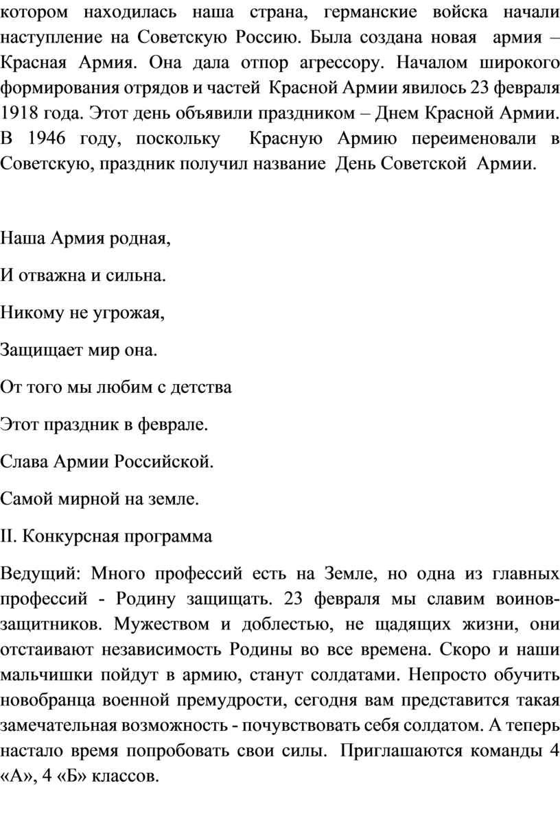 Ведущий: Много профессий есть на Земле, но одна из главных профессий - Родину защищать. 23 февраля мы славим воинов-защитников. Мужеством и доблестью, не щадящих жизни, они отстаивают независимость Родины во все времена. Скоро и наши мальчишки пойдут в армию, станут солдатами. Непросто обучить новобранца военной премудрости, сегодня вам представится такая замечательная возможность - почувствовать себя солдатом. А теперь настало время попробовать свои силы. Приглашаются команды 4 «А», 4 «Б» классов.