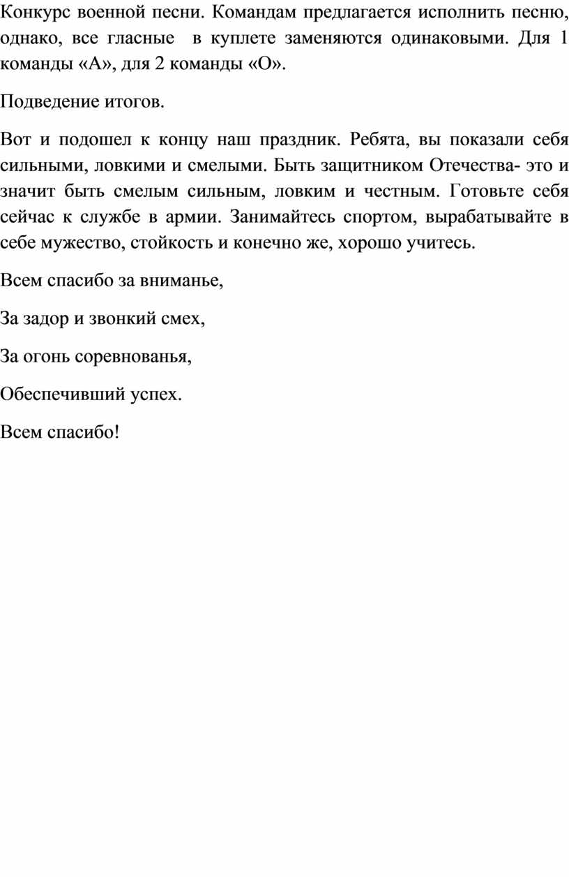 Конкурс военной песни. Командам предлагается исполнить песню, однако, все гласные в куплете заменяются одинаковыми. Для 1 команды «А», для 2 команды «О».