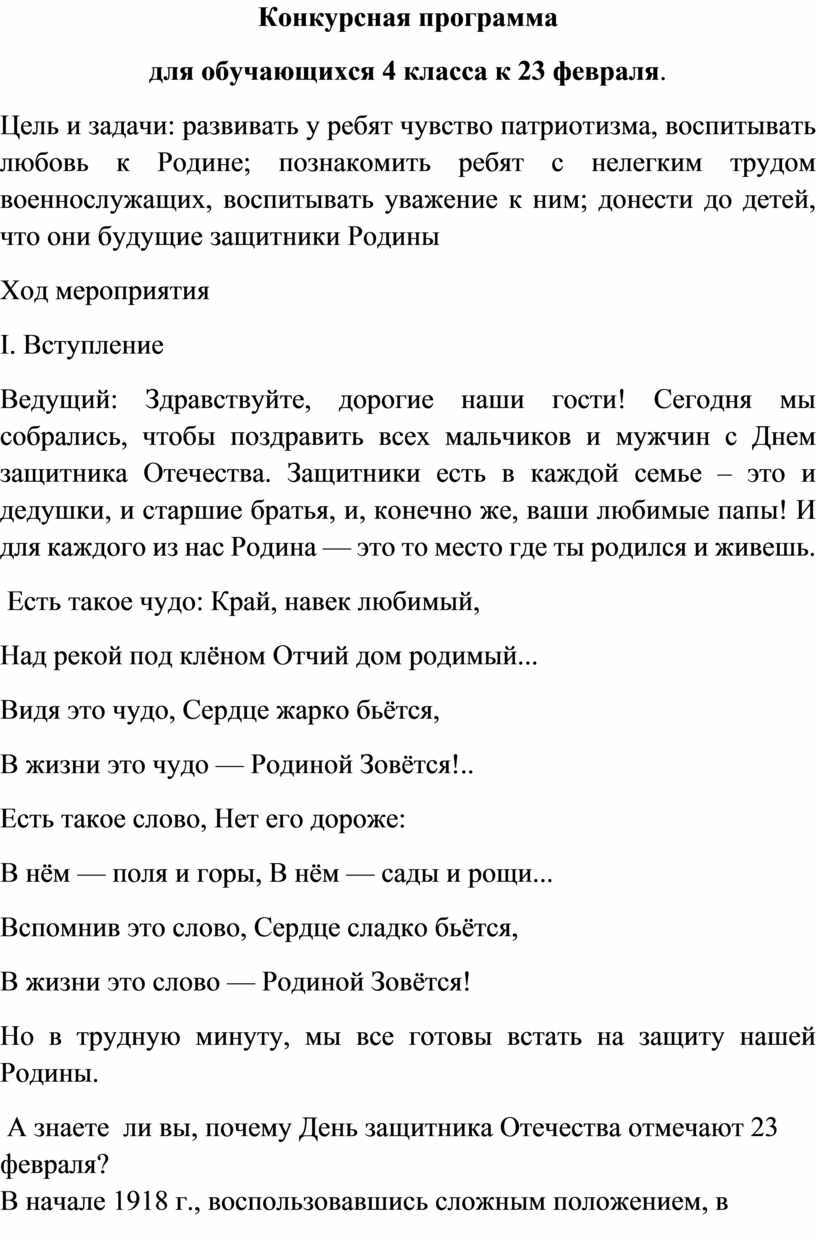 для обучающихся 4 класса к 23 февраля.