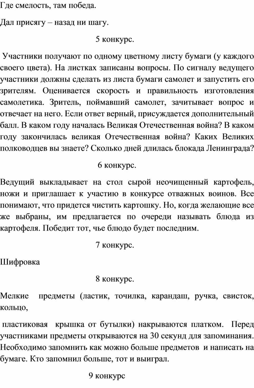 Участники получают по одному цветному листу бумаги (у каждого своего цвета). На листках записаны вопросы. По сигналу ведущего участники должны сделать из листа бумаги самолет и запустить его зрителям. Оценивается скорость и правильность изготовления самолетика. Зритель, поймавший самолет, зачитывает вопрос и отвечает на него. Если ответ верный, присуждается дополнительный балл. В каком году началась Великая Отечественная война? В каком году закончилась великая Отечественная война? Каких Великих полководцев вы знаете? Сколько дней длилась блокада Ленинграда?
