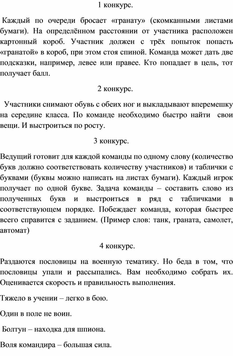 Ведущий готовит для каждой команды по одному слову (количество букв должно соответствовать количеству участников) и таблички с буквами (буквы можно написать на листах бумаги). Каждый игрок получает по одной букве. Задача команды – составить слово из полученных букв и выстроиться в ряд с табличками в соответствующем порядке. Побеждает команда, которая быстрее всего справится с заданием. (Пример слов: танк, граната, самолет, автомат)