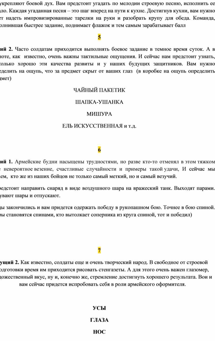 Ведущий 1. Все мы знаем, что одно из долгожданных для солдата – это время обеда. Нашим бойцам, чтобы добраться до кухни предстоит пройти путь вместе с песней, ведь, как известно, песни укрепляют боевой дух. Вам предстоит угадать по мелодии строевую песню, исполнить ее начало. Каждая угаданная песня – это шаг вперед на пути к кухне. Достигнув кухни, вам нужно будет надеть импровизированные тарелки на руки и разобрать крупу для обеда. Команда, выполнившая быстрее задание, поднимает флажок и тем самым зарабатывает балл