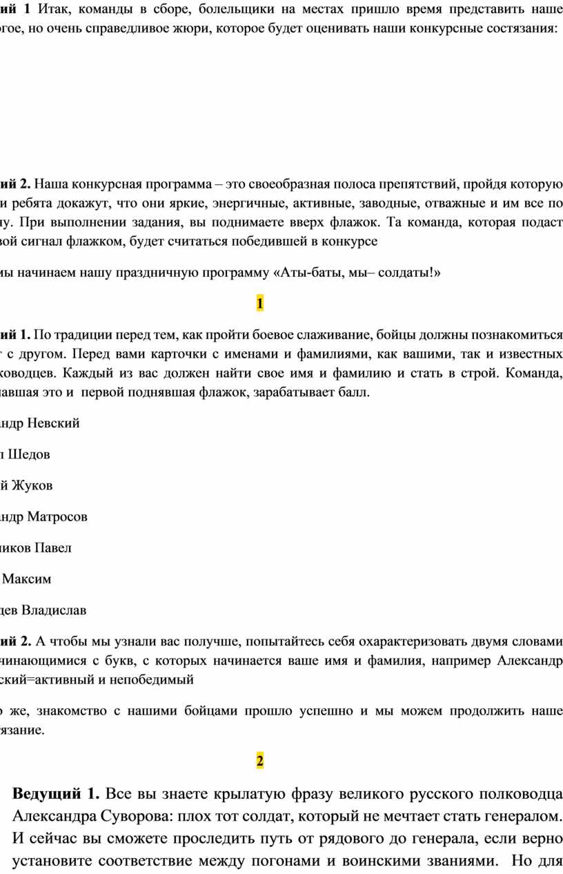 Ведущий 1. По традиции перед тем, как пройти боевое слаживание, бойцы должны познакомиться друг с другом. Перед вами карточки с именами и фамилиями, как вашими, так и известных полководцев. Каждый из вас должен найти свое имя и фамилию и стать в строй. Команда, сделавшая это и первой поднявшая флажок, зарабатывает балл.