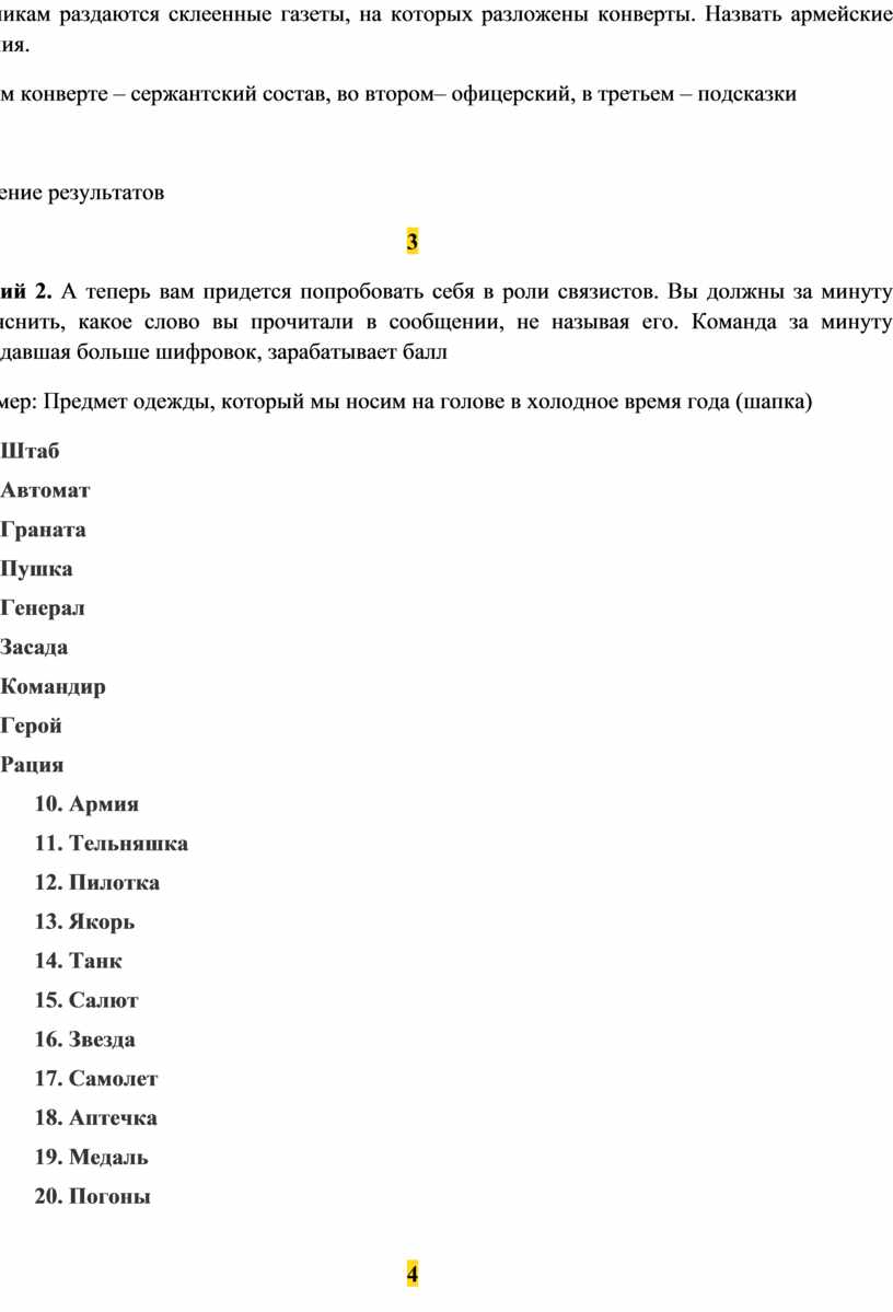 Участникам раздаются склеенные газеты, на которых разложены конверты. Назвать армейские звания.