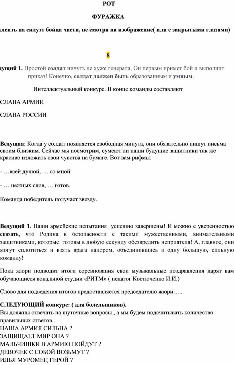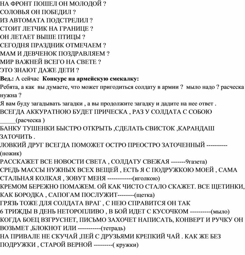 Ведущая: Когда у солдат появляется свободная минута, они обязательно пишут письма своим близким. Сейчас мы посмотрим, сумеют ли наши будущие защитники так же красиво изложить свои чувства на бумаге. Вот вам рифмы: