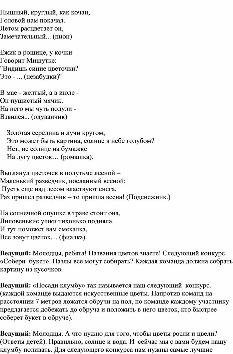 Ведущий: Добрый день, дорогие ребята! Наша конкурсная программа посвящена цветам - прекрасным творениям природы. Цветов на свете очень, очень много. Сколько нежностей в них названиях! Василек, колокольчик, маргаритки, одуванчик, лютик, фиалки. А вы знаете, что по легенде, каждый цветок – это упавшая с неба звезда. Нет на земле ничего прекраснее и нежнее цветов. И для начала давайте проверим – хорошо ли вы знаете цветы. Готовы ли вы к первому конкурсу?