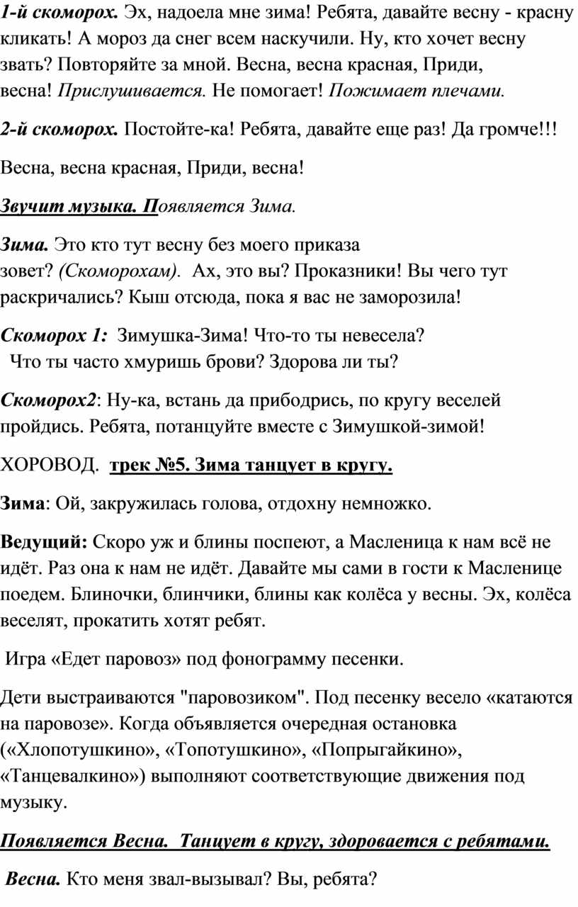 1-й скоморох. Эх, надоела мне зима! Ребята, давайте весну - красну кликать! А мороз да снег всем наскучили. Ну, кто хочет весну звать? Повторяйте за мной. Весна, весна красная, Приди, весна! Прислушивается. Не помогает! Пожимает плечами.