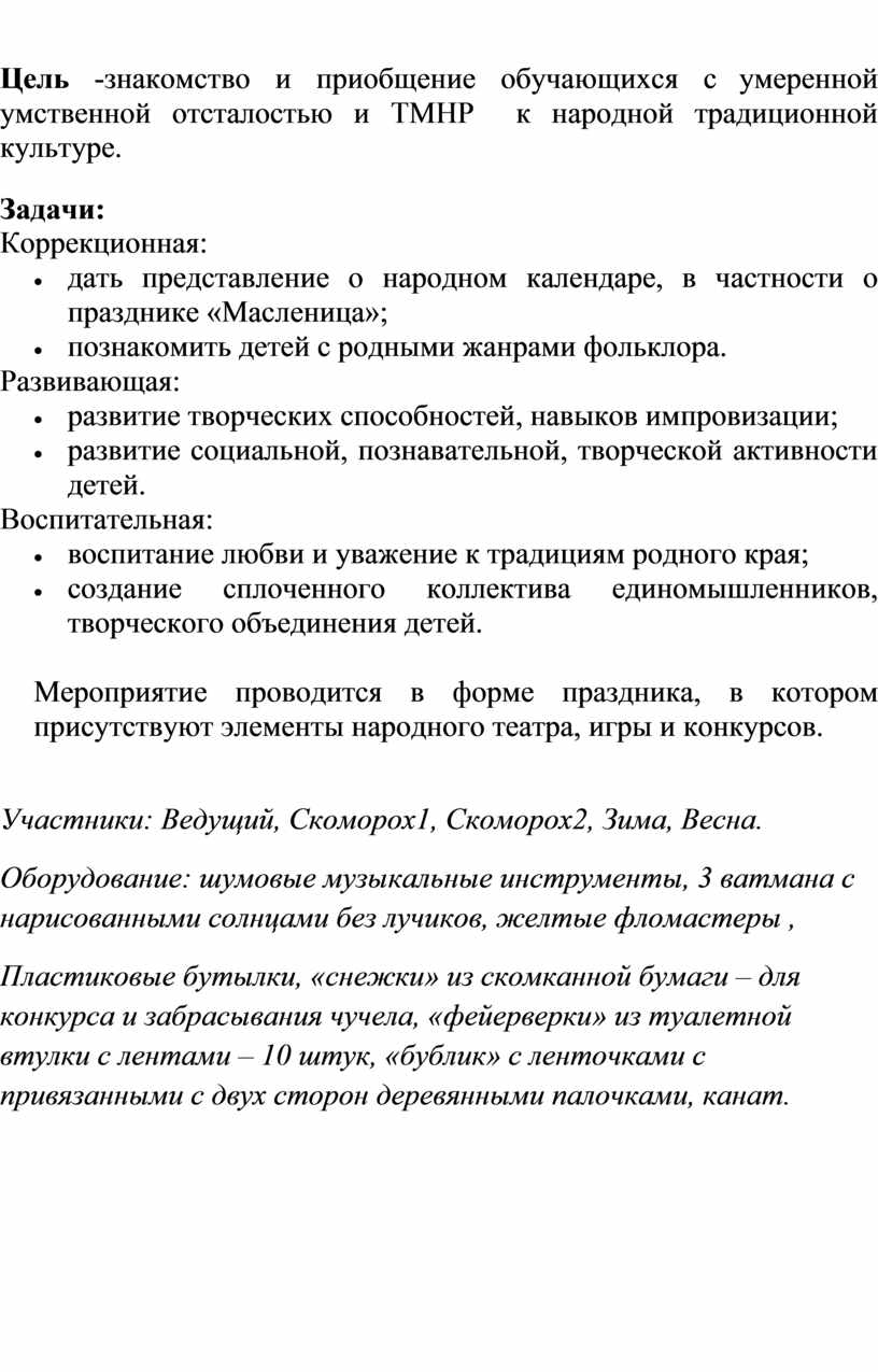 Цель -знакомство и приобщение обучающихся с умеренной умственной отсталостью и ТМНР к народной традиционной культуре.