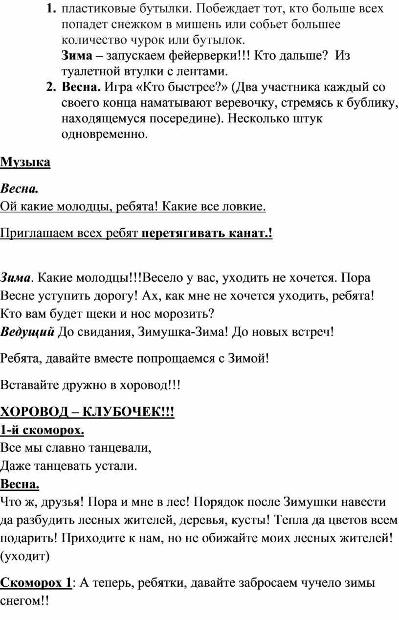 Участники: Ведущий, Скоморох1, Скоморох2, Зима, Весна.